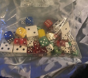 Bag of assorted dice of all different sizes, colors and ages
