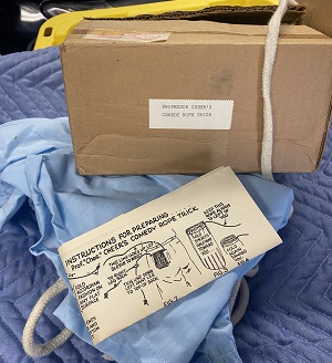 During his show, the performer notices a piece of rope hanging out his sleeve. He pulls on the end of the rope and it just keeps coming out until there is 50 feet of rope lying on the floor at which point it gets stuck. He looks down and finds the other end of the rope in his left trouser leg. When this end is pulled, the rope from the sleeve travels back up and out the pant leg until it gets stuck again! Another end is discovered in the right pant leg and when this is pulled the rope again travels all the way through but gets stuck at the end! Frustrated, the performer finally gives the rope a hard tug and everyone is surprised to see his underwear hanging off the end of the rope! Although three ends were seen in the routine, you are left with only two...one of which is now dangling the shorts!
