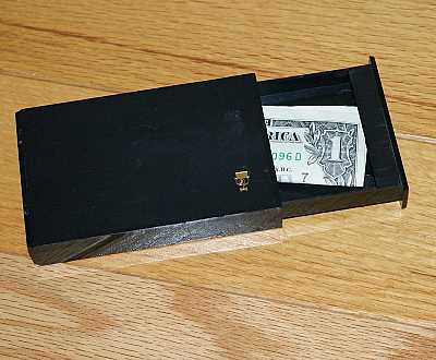 The box will vanish (or appear) anything that will fit inside. Shown in the photo with a folded US dollar bill. I believe it was made to fit cigarettes, but those short filter-less cigs that they smoke in Japan and Europe (or at least did in the 1970s). A regular filtered cigarette won't fit in the box -- too long. I thought this might be a cool business card card, but standard sized biz cards are also slightly too long to fit. But a folded bill, or a wedding ring, etc (anything that fits) can be made to vanish.