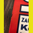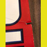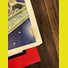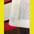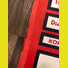 White blocks with blue lettering and borders with a blue and white square picture in the center and red lettering on white all on a red background.