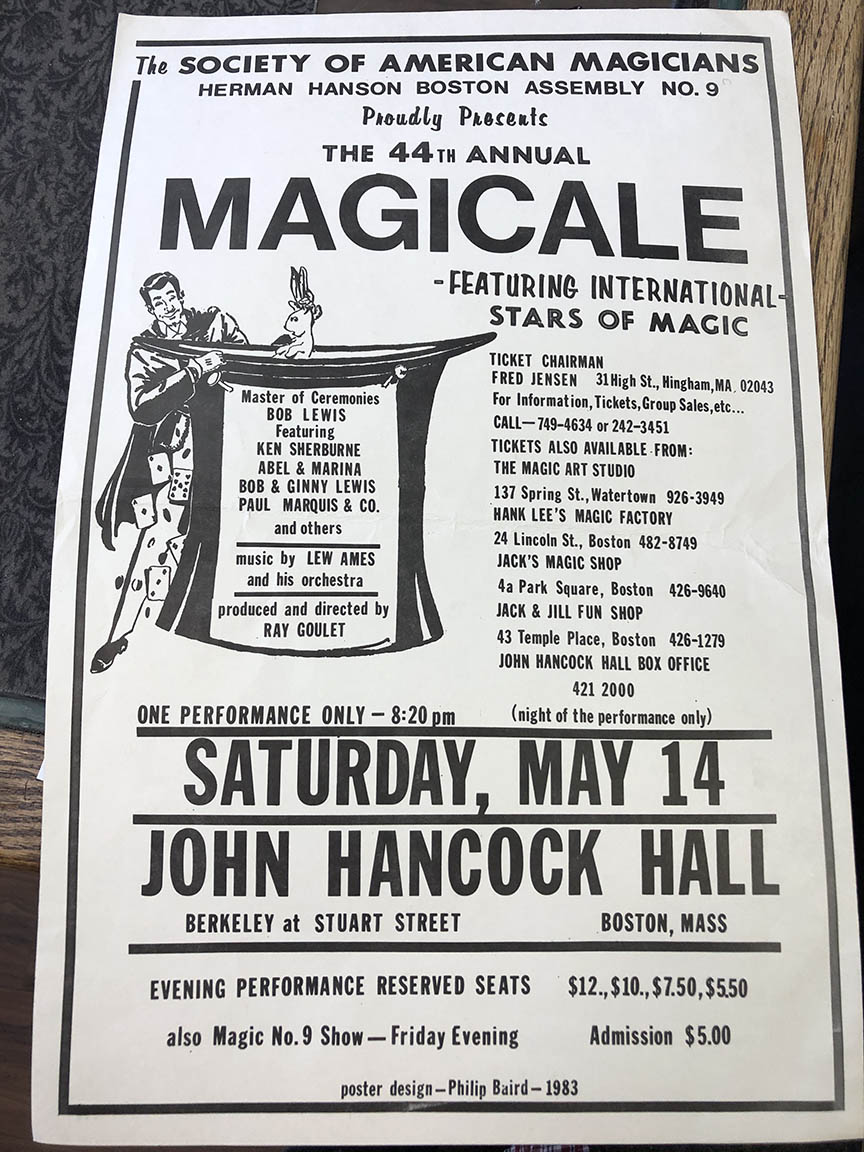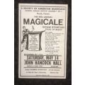 MAGICALE (Lg. black letters) upper middle. Drawing of magician next to huge top hat. Sign on hat lists line-up: Bob Lewis, Ken Sherburne, Abel & Marina, Bob & Ginny Lewis, Paul Marquis & Co